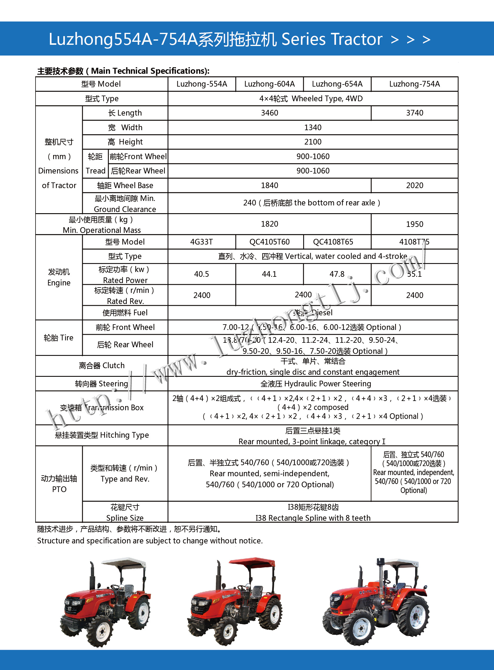 匹配60馬力國內名優國三發動機,排放升級,油耗低,扭力儲備大,動力強勁。超短軸距設計,標配可調方向盤,操縱更靈活,液壓獨立供油,全液壓獨立轉向,轉彎半徑小。采用雙作用離合器,8+4檔中拖底盤,可選裝側變速掛檔,爬行檔,梭式換檔,檔位匹配合理。可選裝強壓提升器,提升力大,提升速度快,可靠性更高,可選裝雙輪胎,增加驅動力。全新流線型雕塑機罩,外形更美觀。應用廣泛,可滿足大棚、林果業、普通農田等地域的耕種需求。